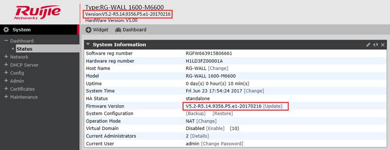 5)      RG-WALL login: After the system is restarted, login to the system byentering https://192.168.1.200 in the URL bar of thebrowser and you will see software version V5.2-R5.14.9605.P6.e2-20180227 on thehomepage.